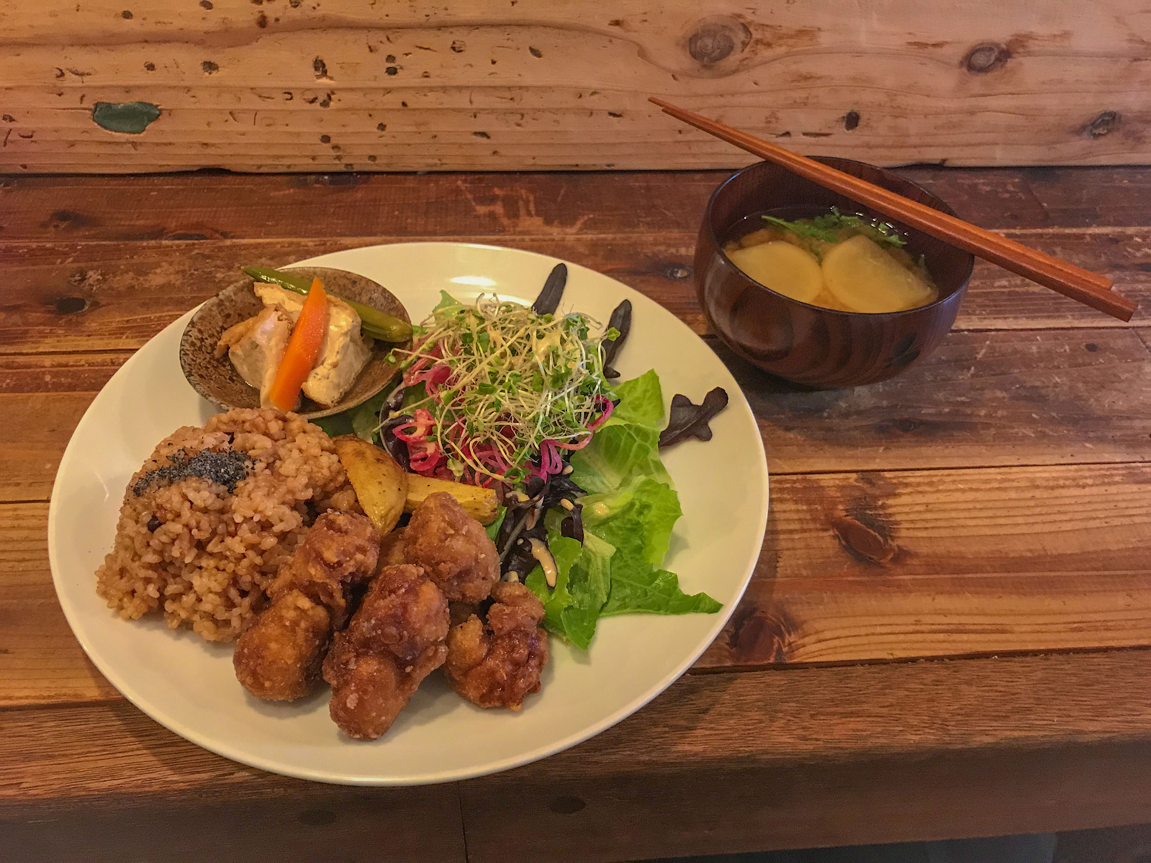For lunch (it only opens for lunch), there are two sets to choose from that change every few days. I had an enzyme rice, soy-chicken cutlet, salad (with many vegetables!), fried tofu, and miso soup. All of this delicious cuisine was only 1,000 yen!