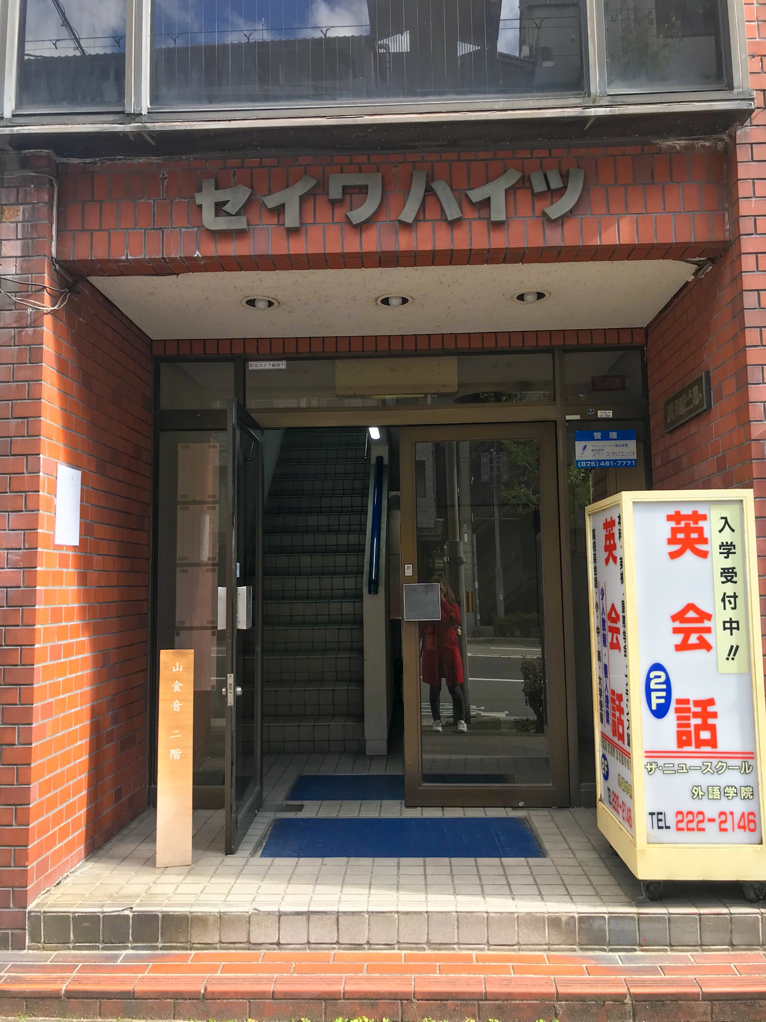 This place is a little hard to find, although it is in the heart of Kyoto. It’s on the second floor of the building, which it shares with a small language school. If you’re on the street level, you won’t find a sign indicating that the restaurant’s there, so look out for the red building in the picture below. From the second floor window, you can see the main street of Kawaramachi, and the restaurant’s not too far from Demachiyanagi Station. I really liked that there’s an open kitchen – or maybe I should say that the ‘bar’ is actually the kitchen (just like all the restaurants from last time). The place is designed as a nice urban space, with the option to sit at the bar or at a large dining table that all customers share. The hiking equipment, on the other hand, can be found near the door. Overall, the design is clean with a little personal touch (in the form of heaping piles of books, as well as sound equipment and lit-up decorations).