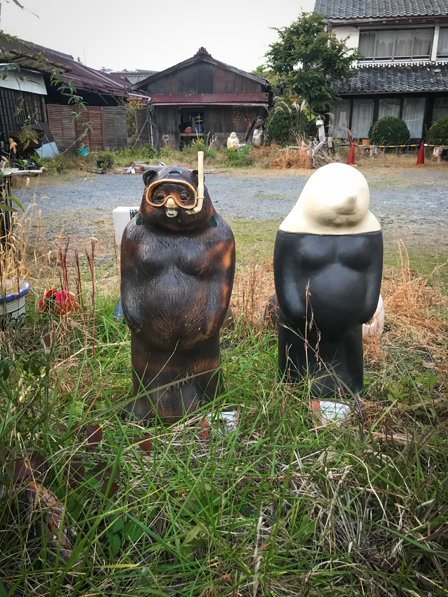 The tanuki statues depict the Shinto god Tanuki who sometimes shapeshifts and appears as the tanuki animal, sometimes in other forms. Tanuki is portrayed as an agreeable but naughty character who is always carrying a jug of sake and a promissory note. Ah yes – he also has a giant scrotum. It’s a fundamental part of his figure, so just go along with it.