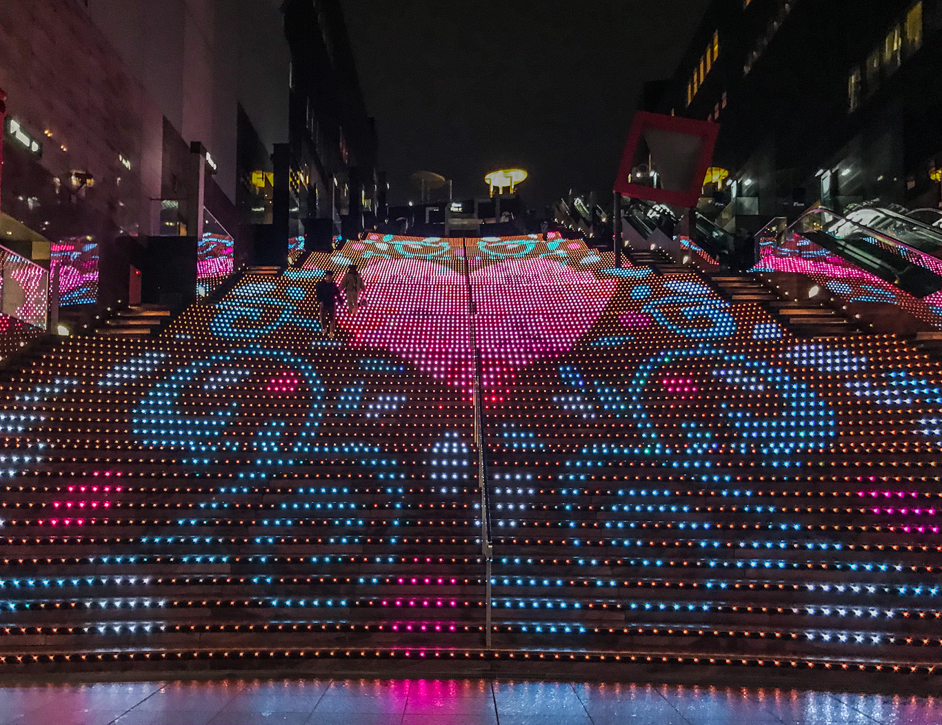 The Great Staircase – an awesome feature of Kyoto Station! Every evening, the staircase on the West side of the station has an incredible graphic illumination of 15,000 LED lights.